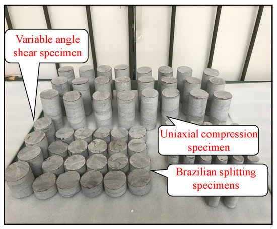 The specimens were processed into uniaxial compression specimens, Brazilian split specimens, and variable angle shear specimens according to the specimen size standard recommended by the International Society of Rock Mechanics. The specimens were cylindrical with a diameter of 50 mm and a height-to-diameter ratio of 2:1, 1:2, and 1:1, respectively. The specimens were screened, and finally the specimens with parallel top and bottom end surfaces and good flatness and high integrity were obtained, measuring the volume and mass of each specimen. The processing accuracy was guaranteed to meet the test requirements, and some specimens are shown in Figure 1.