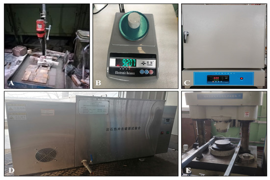 As shown in Figure 2, the test equipment used in this paper are: a rock coring drilling machine (A), a high precision electronic scale (B), a programmable temperature-controlled muffle furnace (C), a rock thermal shock rupture test bench (D), a microcomputer-controlled electric-hydraulic servo press (E).