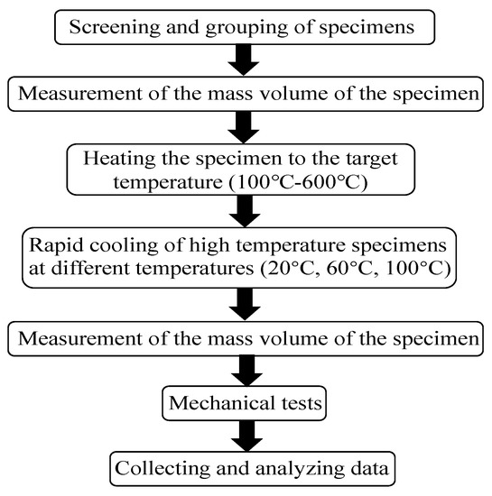 Thermal shock phenomena are commonly found in the field of science and technology. For example, geothermal development, thermal rock breaking, high-temperature overwater tunnel construction, nuclear waste disposal, etc. Therefore, rock thermal shock has received a lot of attention. Rock thermal shock is a phenomenon in which a large amount of heat exchange occurs in a short time when a rock is sharply heated or cooled, and the temperature dramatically changes, creating a huge temperature gradient inside the rock [1,2]. Rocks are a typical porous media material, and the mineral crystals that make up the rock have different lattice energies and thermal expansion coefficients. As the degree of thermal shock increases, the thermal shock velocity increases, the intermolecular binding force decreases, and the thermal stress of the shock exceeds the destructive strength of the rock [3,4,5,6]. The rock will generate a large number of fractures and cracks from the micro and fine levels, promoting the connectivity of the fracture network. This leads to changes in physical and mechanical properties such as bulk density, compressive strength, and tensile strength [7,8]. These variations are complex, and are different for different rock types [9]. Therefore, the study of the evolution of physical and mechanical properties of rocks under the effect of thermal shock is of great significance for the in-depth understanding and development of high-temperature rock mechanics.