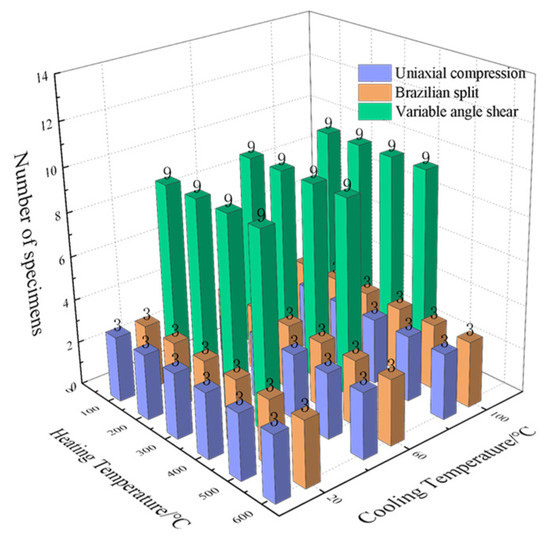 The experimental study program is shown in Figure 3. The limestone specimens were heated to 100 °C–600 °C at a heating rate of 3 °C/h, respectively, and held in a muffle furnace for 4 h. Then, the stable high temperature specimens were quickly cooled in water at different temperatures (20 °C, 60 °C, 100 °C). The mass and volume of each specimen were measured after cooling. A group of normal temperature limestone specimens without thermal shock treatment was set as the control group. A total of 19 temperature working conditions were set for the experiment. Finally, the uniaxial compression test, Brazilian split test, and variable angle shear test were performed by microcomputer-controlled electro-hydraulic servo press, and the test data were analyzed by taking the average value. The test piece grouping information is shown in Figure 4.