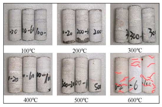 As shown in Figure 5, the apparent color of Huizhou limestone under the effect of thermal shock is mainly affected by the peak temperature of heating. The surface of the specimen heated at 300 °C or less is grayish white, with local greenish gray and rusty red mineral inclusions. When heated to 400 °C~500 °C, the surface of the specimen changes to earthy yellow and the range of rusty red increases. In contrast to the conclusions reached by other studies [12] (significant changes in limestone surface color after high temperature action at 700 °C), the apparent color of the specimens significantly changed at 600 °C under thermal shock; i.e., an overall shift to white. It shows that the thermal shock effect is stronger than the high temperature effect on limestone when the heating temperature is the same.