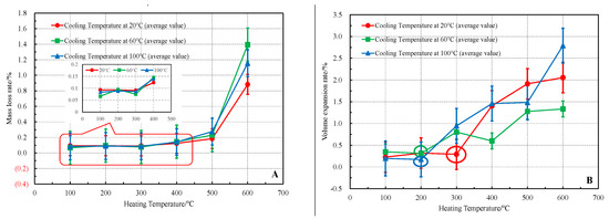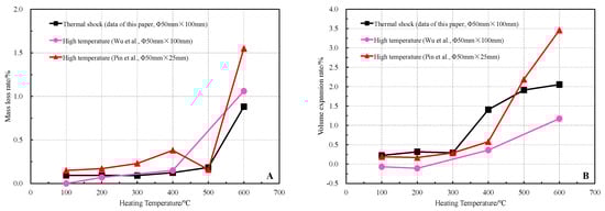 Results of the evolution of mass loss rate (A) and volume expansion rate (B) of limestone under different heat treatments (the black part is the data obtained after cooling the high temperature limestone in water at 20 °C) [10,18].