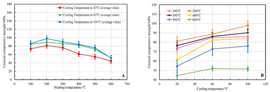 Results of uniaxial compressive strength of limestone with heating temperature (A) and cooling temperature (B).