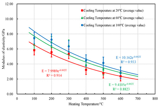 The elastic modulus of limestone after thermal shock and the heating temperature (100 °C~600 °C) were fitted as shown in Figure 9. There is a good exponential function relationship between the two parameters. The following empirical expressions were obtained.