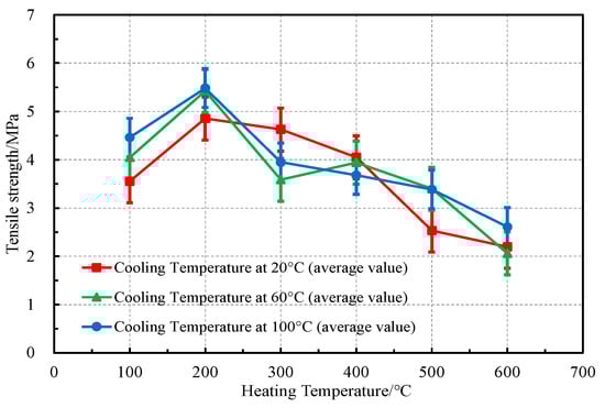 As shown in Figure 10, the tensile strength of limestone specimens after thermal shock at different cooling temperatures showed a tendency to increase and then decrease with increasing heating temperature. It is worth mentioning that this is consistent with the evolution of uniaxial compressive strength with heating temperature. The reasons for this result are described in Section 3.2.1. The tensile strength of limestone specimens decreased from 3.39 MPa of the original rock to 2.19 MPa (35.4%), 2.06 MPa (39.2%), and 2.61 MPa (23%) after thermal shock in water at 20 °C, 60 °C, and 100 °C, respectively. The percentages in parentheses are the reduction rates. It can be seen that the cooling temperature also has some effect on the tensile strength. A good exponential relationship between the tensile strength and heating temperature of limestone in the range of 200 °C to 600 °C was fitted, as shown below: