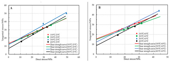 From Table 2, it can be seen that the characteristics of shear strength curves of limestone after thermal shock at different temperature working conditions are similar, so a set of typical curves were plotted for analysis. As shown in Figure 11A, the shear strength curve of limestone specimens after thermal shock in water of a given temperature increases in inclination and decreases in intercept with the increase in heating temperature, which shows a rotation in the σ-τ coordinate system in the counterclockwise direction. From Figure 11B, it can be seen that the shear strength curves of limestone specimens at the same temperature after thermal shock in water at different temperatures decrease in inclination and increase in intercept with the increase in cooling temperature, and rotate in the clockwise direction in the σ-τ coordinate system. The change characteristics are opposite to the shear strength curves at different heating temperatures. The shear strength curve obtained from the test can determine whether the limestone remains stable after thermal shock in a high temperature environment: if the stress value at the measured position in the rock lies in the region below the curve, the rock is stable; otherwise, the rock is destabilized. Therefore, the shear strength curve of rocks under thermal shock is important for the analysis of high temperature rock stability.