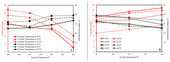Limestone shear parameters for different heating temperatures (A) and different cooling temperatures (B) after thermal shock.