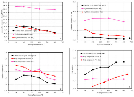 The elastic modulus of limestone after thermal shock is smaller than that after high temperature. In addition, the values of elastic modulus obtained by Wu et al. are larger than the data obtained from the other two tests. This is because the mineral content of the constituent limestone has a greater effect on the elastic modulus; the higher the calcite content, the higher the strength of the limestone. The mineral contents of limestone used in the three groups of tests conducted for comparison were different; the calcite content of Jiaozuo limestone used by Wu et al. was 95%, and the calcite content of Osaka limestone used by Chen et al. and Huizhou limestone used in this paper were both 92%, so the elastic modulus value of Jiaozuo limestone after high temperature was the largest.