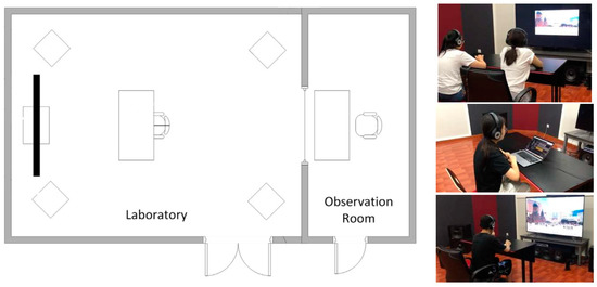 The experiments were conducted in a laboratory at the Harbin Institute of Technology in China, shown in Figure 1. The volume of the laboratory was 186 m3, and the background noise was 11 dBA. A TV screen (Samsung H6400: 166.030 cm × 93.375 cm (75 in)), resolution: 1920*1080 p ) was used for live video playback. Participants were asked to sit in designated seats. Sennheiser rs170 headphones provided the audio. To ensure that participants could concentrate on the test, no items other than the necessary equipment were present in the laboratory.