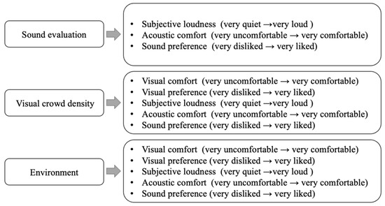 - Next, we investigated the effect of crowd density on participants’ evaluations of the sound environment. The three sets of images in Figure 2a were randomly combined with low, medium, and high human voices, a total of nine audio sets. Each group of materials was played for 20 s with 10 s intervals to answer the questions;