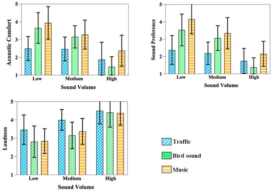 A one-way ANOVA was run to test the differences in mean ratings between the subgroups divided by the variables that interacted. After removing the factors without statistical significance, the model was simplified. Figure 4 shows the evaluation of the acoustic metrics after superimposing the human voice with different sound types (birdsong, traffic sounds, and music) under the auditory-only stimuli. (The error bars represent the standard deviation [S.D.] of the average values.) In terms of loudness, there was an interaction between the type of sound and the volume. With respect to sound types, regardless of the variation in volume level, the loudness of the human voice after superimposing bird sounds and musical sounds was rated lower than that of traffic noise. When the participants heard the first two sound types, they did not feel the sound loudness as much. The participants even felt slightly quiet for the low- and medium-volume human voice superimposed with birdsong and music (p < 0.01). With respect to volume level, sound loudness increased significantly with increasing volume level; that is, the higher the volume, the louder the participants felt (p < 0.01).