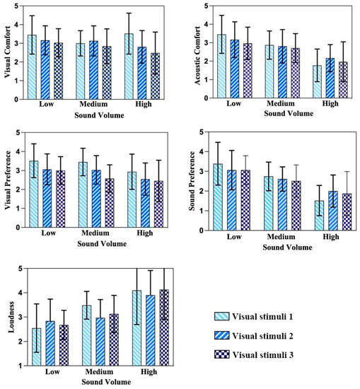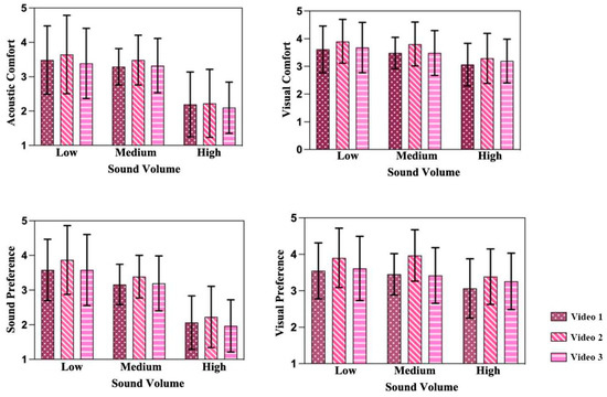 Figure 6 shows the sound preferences for conversational sounds in different environments under simultaneous audio–visual stimuli (The error bars represent the S.D. of the average values). For all three environmental groups, there was no significant difference between the overall preference and visual environment preference scores for the same background sound. However, there was a significant difference in the sound preference and acoustic comfort scores for the three groups of sounds in the same set of visual environments. The change in volume also significantly affected visual preference and comfort scores. For the original three groups of voices, the lower the sound, the higher the sound preference score (p < 0.01). The overall preference and comfort scores changed after adding visual factors. The environmental evaluation of the videos one and two changed from significant to non-significant, with a difference in scores between the low and medium groups. The difference between the scores of the medium and high groups was still significant (p < 0.01). The louder the sound, the lower the overall preference and comfort scores. Therefore, after adding the visual factor, evaluations of the overall environment were not affected when the sound pressure level of the human voice was at 45.6 to 55.6 db. However, when the sound pressure level was 55.6 to 66.6 dB, overall environment scores were lower as the sound got louder.