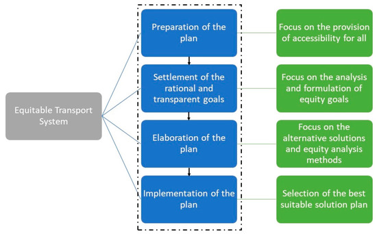 According to the Guidelines and Roadmap for EU equity planning [26], the main equity goals that need to be achieved in cities are the fair allocation of transport resources, the provision of equal opportunities to enable people to be mobile and have access to important activities in their life, and the reduction of the adverse effects of the transport system, which includes pollution, accidents, and social exclusion. Figure 1 shows a diagram of elements that need to be considered for an equitable mobility planning policy.