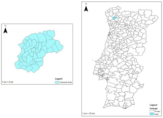 Braga is located in the north of Portugal and has a population of more than 190,000 inhabitants in an area of 183 km2, which represents a population density of more than 1000 inhabitants per km2 [60], distributed in 37 parishes (Figure 2). In Braga, 68% of the resident population is between 15 years old and 64 years old, which is the active population. In addition, 25% of the population is between 20 years old and 39 years old [60], which are the most representative ages for shared e-scooter usage according to the data presented in Table 1. The average monthly income of the population is EUR 1145.8, but for men, it is as high as EUR 1228.6, while for women it only reaches EUR 1033.6 [60].