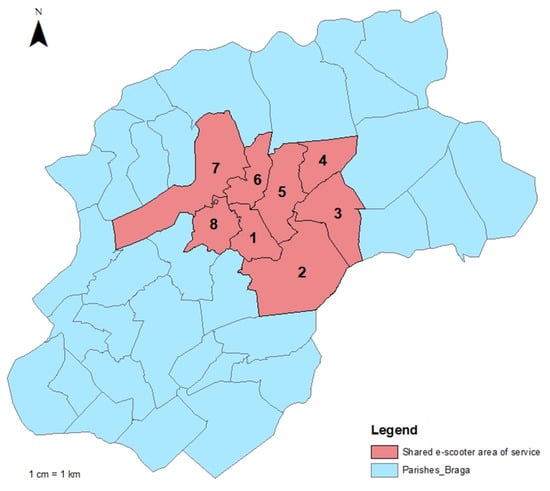 Figure 3 represents the actual area covered by e-scooter services in the city of Braga, encompassing only eight out of thirty-seven parishes in Braga. The parishes and their respective population are as follows: (1) São José de São Lázaro e São João do Souto (14,791 inhabitants); (2) Nogueira, Fraião e Lamaçães (15,015 inhabitants); (3) Nogueiró e Tenões (5946 inhabitants); (4) Gualtar (6761 inhabitants); (5) São Victor (32,876 inhabitants); (6) São Vicente (13,974 inhabitants); (7) Real Dume e Semelhe (13,682 inhabitants); and (8) Maximinos, Sé e Cividade (15,087 inhabitants). The resident population in the area served by shared e-scooters corresponds to more than 60% of the total population in Braga.