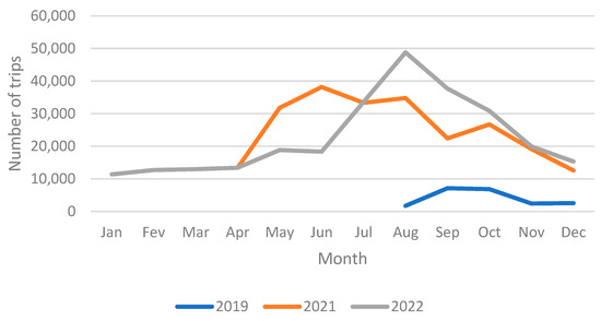 Shared e-scooter services in Braga have been developing since 2019, when they were introduced in the city. Starting with only one company in 2019, there are now two different companies responsible for offering the service to the population. From August to December 2019, more than 20,000 trips were made by about 80 e-scooters. The year 2020 was marked by the mobility restrictions imposed by the COVID-19 pandemic, and thus there is a lack of data from this year. In 2021, when the service resumed in April, more than 230,000 trips were made until December of the same year. Then, in 2022, when two different companies made available more than 500 e-scooters, more than 270,000 trips were made from January to December (Figure 4).