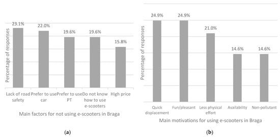 The main factors affecting shared e-scooter usage in Braga: (a) Main factors for not using shared e-scooters in Braga; (b) Main motivations for using shared e-scooters in Braga.