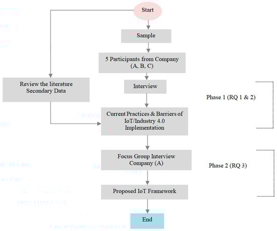 Figure 1 shows the flow chart of this research. It was carried out using a qualitative method through online interviews and a focus group. The qualitative method provides insights into research objectives through primary data and helps to improve the ideas or hypotheses of a new framework’s implementation [76]. Therefore, this study adopted the qualitative method. Five participants, representing various positions within three different SMEs, were chosen as respondents. These individuals included a plant manager, two project managers, the CEO, and an information technology officer. These participants were selected based on their extensive experience in the industry and their ability to provide insightful information about IoT implementation in SMEs. The first phase was focused on achieving the first two objectives of this study. The sample for the research study is presented in Table 1, including relevant information about the participants such as department, company, current position, and years of experience. In the first phase of the research, two parts were conducted using the interview method. For each part, five interviews were conducted with the same participants. The participants were selected based on their expertise and experience in the fields of the IoT and Industry 4.0 in Malaysian SMEs. The second phase of the research was conducted using the focus group interview method. Only one interview was conducted with participants from one company (A). The focus group interview allowed for the exploration of collective opinions and experiences, thus providing a deeper understanding of the phenomenon [77].