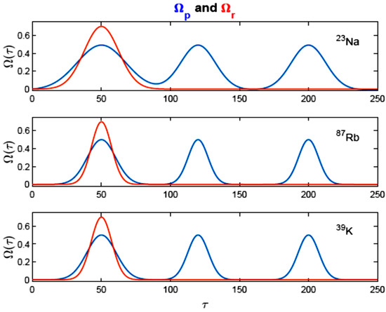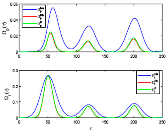The shapes for the probe and drive pulses for various vapours are shown in Figure 2. Along the boundary ζ = 0, the pulses are formed as truncated-Gaussian pulses in time, which are characterized by different widths. We have used the driving pulse of one pulse, whereas the probing pulses formed a Gaussian train. Through 23Na vapour, we used pulses with envelopes that were not exactly matched in time, as the driving is narrower than the first probing pulse in the train. Let the pulse-width be denoted as w and γ is the spontaneous decay rate of the fine-structure transition. Consequently, the triples {{γNa, wNa }, {γRb, wRb }, and {γK, wK }} are obtained for the specific gases addressed in this study. The width compression in 87Rb and 39K gives rise to determined pulses through long times and near initial times. However, this is not true for the 23Na case, in particular for the first and second pulses. In the pulses’ far-wings, the overlap is significant. During computations, we have kept the amplitude v0 the same, in agreement with . Thus, the pulses degenerate with respect to the amplitudes of the field. The degeneracy is removed as the intensity I is expressed as where Is is the saturation intensity.