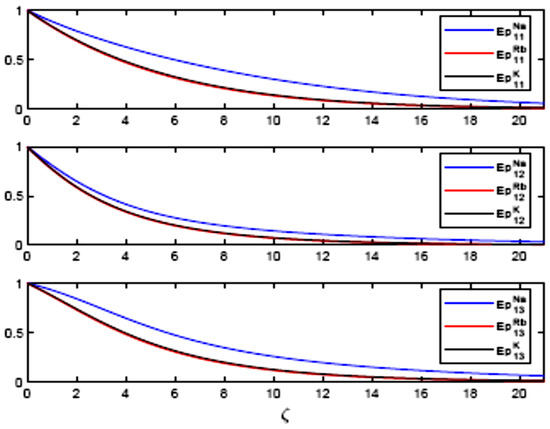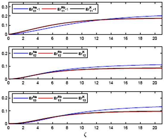 Figure 3 and Figure 4 expose the space dependence of the relative energies for both probe and drive pulses, where one is subtracted from the first drive pulse’s energy to indicate the gain. In the representation E1j, j = 1–3, the first suffix 1 indicates the lower (first) Λ subsystem is concerned, as shown in Figure 1. Figure 3 exhibits the attenuation of probe pulses for different alkali vapours. Propagation in the probe channel is less attenuated in sodium vapours. Initially, the probe pulses have more energy than others. The attenuation in rubidium and potassium is similar, whereas depletion did not depend on whether or not pulses matched. Figure 4 displays amplification in the first drive pulse and gain in time sections T2 and T3, which is due to the generated Stokes field in the Raman transition. In alkali vapours, different gain mechanisms concerning hf structure can occur [38,39]. In the numerical results, we have focused our attention on the amplification of the generated Stokes field and the time dependence of its phase sequences, as shown in Figure 3 and Figure 4. It is noted that, in our treatment, we have an incomplete LS experiment. This is because of the absence of the read pulse in the drive channel. Thus, the Stokes field generation is viewed as energy retrieval without invoking the traditional read pulse. Moreover, the phase sequence is associated with the restored Stokes field. The energy restored in the drive channel is written by the probe train. Our input pulses are not equivalent pulses, in the sense that it has not had the same energy and the same mean duration, initially. Therefore, it is difficult to compare the restoring efficiency of different alkali gases that can appear in alkali atoms.