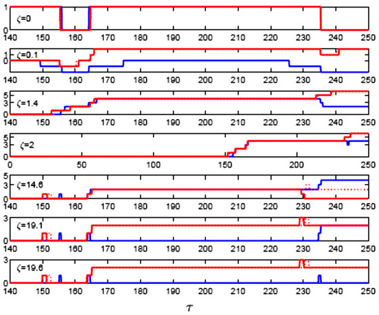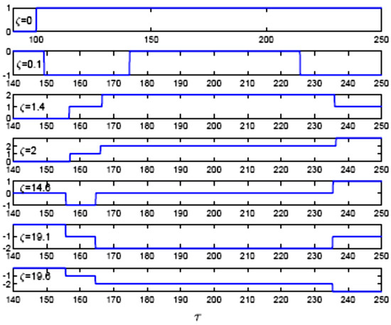 Figure 7 explores the time dependence of the phase patterns as generated through the drive channel counter to various distances through 23Na vapour. At the injection boundary, ζ = 0, the hf-state |3, F = 1⟩ is in resonance with the probe and drive. The results in phase trajectories are obtained upon simple standards, as the phases are generated by the detuned-Λ, which acts as a disturbing subsystem. However, at the initial boundary, ζ = 0, the drive pulse shows phase changing from zero to π, at τ = 100, which is identical to the T2 domain. The interference is dominant in the T2 domain along the trailing edge of the first pulse and the front of the second pulse in the train. We notice that the phase is still zero at times in the classic EIT, T1 part. We observed the drive pulses in the drive channel, such as T2 and T3, which propagate with different phase patterns through the medium for long time intervals, which makes it difficult to define a procedure for phase-pattern recognition. Intuitively, we may use the multilevel π-switches’ regularities within the phase pattern as the distinguishable feature. We shall not investigate the width of the π-switches and the Euclidean time distance between multilevel switches. Hence, we have seven patterns, as shown in Figure 7.