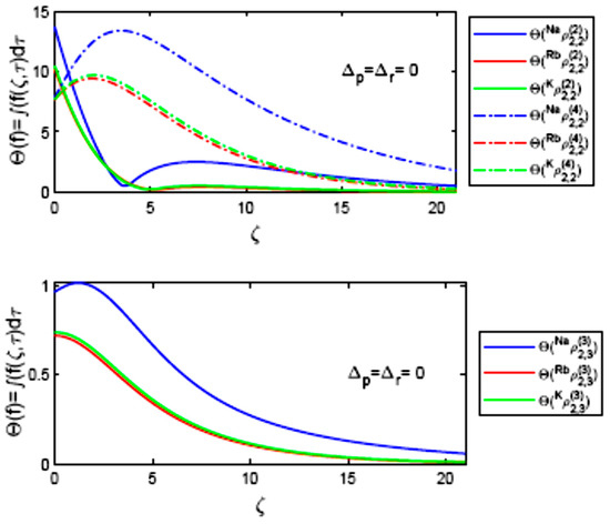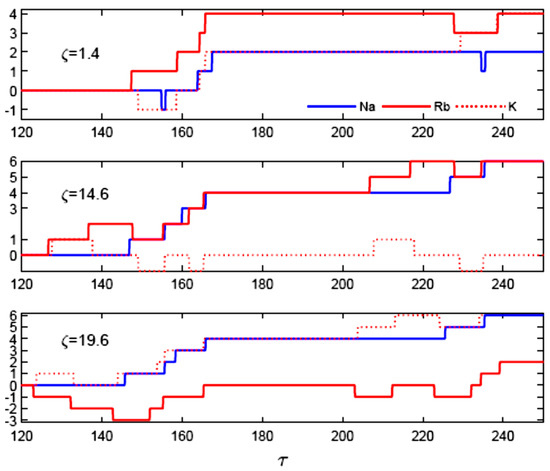 Let us reveal the discrete phase distributions associated with initially weak fields. For such a case, the probe and drive pulses have the same shape as that in Figure 2. However, with amplitude reduction, initially at ζ = 0, as and . Figure 9 displays the relative phase in π units. Different discrete phase distributions for alkali vapours are distinguished. The new behaviour was smeared for potassium and rubidium vapour in the moderate field case. The π transitions are evident in Figure 9. Instead of plotting the shape profiles of the weak pulses, we shall write their effective fields at the desired distances as