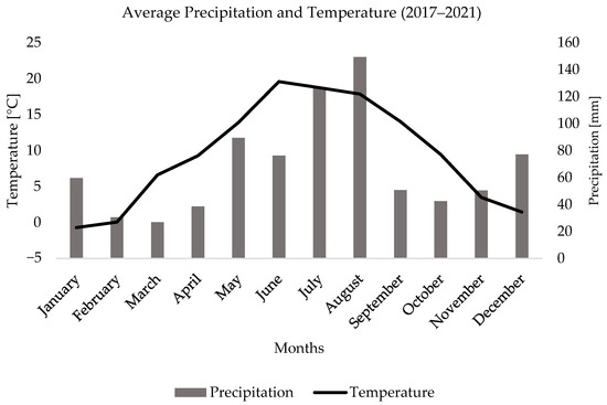 Average precipitation and temperature at research location (2017–2021).