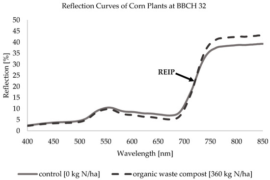 Measuring corn plants fertilized with organic fertilizers using field spectroscopy is much more difficult than other plants fertilized with mineral fertilizers due to the release of soil-borne N in combination with environmental circumstances such as the soil temperature and water supply through rainfall [52]. Nevertheless, it was possible to detect differences in the development of the plants. Similar to the findings of [53], in this experiment the sensor showed these differences in different values of the REIP vegetation index.