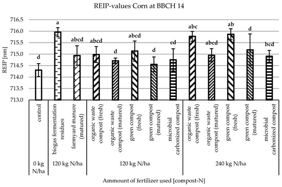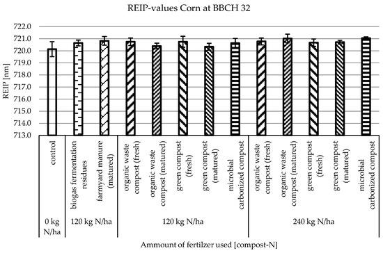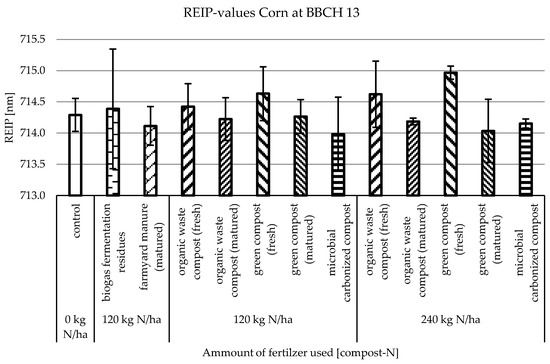 As described, optical sensors have already proven their ability to detect the biomass and nutrient status in conventional grown cereal plants. As corn (Zea mays L.) was in 2021 the most cultivated grain worldwide [48], and although conventional corn cultivation predominates in Germany, a clear expansion of organically grown corn can be observed [49]. Most of the studies using optical sensors to detect the nutrient status of plants in agriculture are made for conventional agricultural systems to guide fertilization. The aim of this study was to research the ability of optical sensors using the REIP vegetation index to detect differences in development of corn plants, where different composts fertilizers were used in an organic field trial.