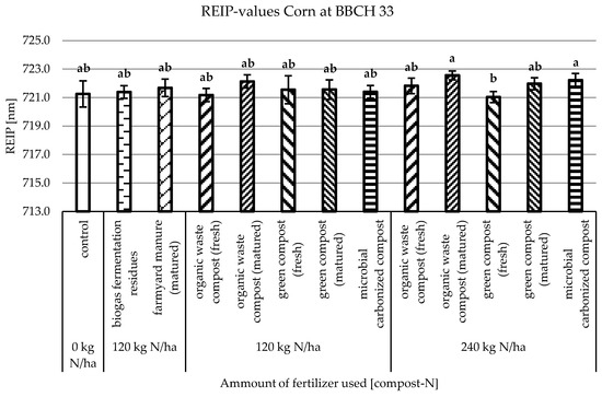 At growth stage BBCH 32 (Figure 5), the REIP-values looked different. The highest values were measured in the variants with matured organic waste compost and microbial carbonized compost with the high application rate. In contrast, the values for the fresh compost and biogas fermentation residue had decreased.