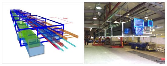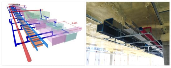 Recently, owing to the complexity of building systems, the scope of prefabrication has been expanded from construction works such as precast concrete and curtain walls to mechanical, electrical, and plumbing (MEP) elements []. In particular, a recent trend in buildings is the use of heavy MEP systems. The prefabrication of MEP components is becoming more sophisticated and advanced, owing to the introduction of BIM technology []. Advances in pre-design review technologies such as BIM have improved the environment where MEP coordination can be performed in advance. Therefore, single-trade prefabrication techniques have been replaced with multi-trade prefabrication techniques that combine the elements of complex works in advance [,]. The multi-trade prefabrication technology requires substantially more effort and time in designing and manufacturing than single-trade prefabrication because it solves conflicts between different work types in advance and manufactures by attaching elements of various work types within one integrated frame. However, it minimizes the fieldwork and reduces the construction period; hence, it holds advantages []. The benefits of combining various elements in one space can be expected to reduce air and increase productivity more than the existing single-trade prefabrication techniques [].