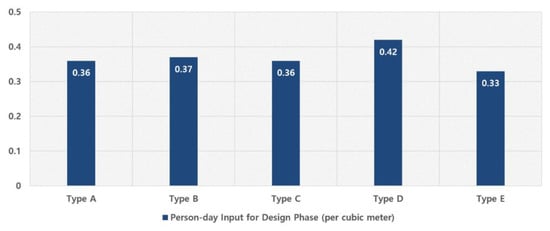 Based on the analysis results of the design, a similar level of labor input was required to design Type A, Type B, and Type C structural frames. Person-day BIM engineer inputs for Type A, Type B, and Type C were 0.36, 0.37, and 0.36, respectively, per cubic meter. Type D and Type E were found to require a relatively high level of labor inputs of 0.42 and 0.33, respectively. The latter was the least number of people required.