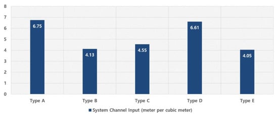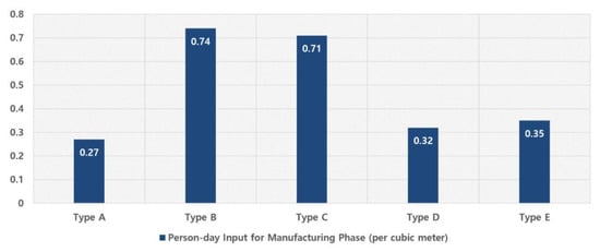 The highest personal-day input was required in the production stage for Type C and Type D. The material input for constructing Type C frames was relatively low; however, a decrease in material input did not lead to a decrease in the person-day input of production. In Type C, structural frames had to be constructed for fixing ducts, and using the basic system channels and both methods simultaneously was expected to be disadvantageous in terms of fabrication effort. In Type D, the most labor cost was invested in the fabrication stage, which is believed to have been affected by the increase in system channel material input.