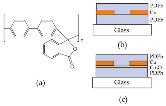 (a) Structural formula of PDPh. Schematic representation of the experimental structure of (b) PDPh/PDPh and (c) PDPh/Cu2O/PDPh.