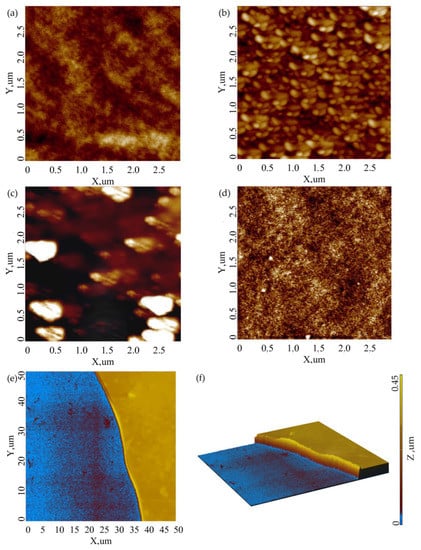 The morphology of the surface of each layer is shown in Figure 2. The surfaces of the polymer films are smooth and flat (Figure 2a,d). The RMS surface roughness deduced from the AFM topography images is ~1 nm. Figure 2e,f shows the topography of the surface and a 3D image of the lower polymer layer with a slice section. The film is homogeneous in thickness except for the small section along the cut. This indicates good film-forming properties of PDPh. This fact has been repeatedly confirmed in our previous works [,,,].