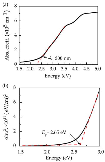 The absorption coefficient lies in the range from 104 to 105 cm−1 (Figure 3a). The absorption region is at a wavelength less than 500 nm. It is known that a value showing > 104 cm−1 indicates the presence of direct electronic transitions [,] occurring from dipole-resolved blue and indigo transitions. A direct band gap is typical for thin films, whereas transitions with an indirect band gap are usually detected for relatively thick films []. In this case, the energy of the forbidden zone () was estimated under the assumption of a permitted forward transition (n = ½). The value of the band gap width is located at the intersection of the linear approximation of the edge of the main absorption (Figure 3b) and the spectrum below the main absorption []. Thus, the value of the Cu2O film is 2.65 eV. It may seem that this value is somewhat overstated. However, it is known that with a decrease in the thickness of the amorphous Cu2O film, the band gap increases []. For example, in [] it was found that a decrease in the size of Cu2O nanoparticles from 3.2 to 2.1 nm leads to an increase in the band gap of 2.15 to 2.71 eV due to the effect of dimensional quantization. Therefore, an increase in in our case may be evidence that the Cu2O film is an island, which is in close agreement with other experimental results [,].