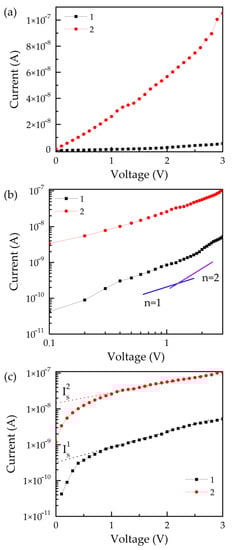 Figure 4 shows typical volt-ampere characteristics (VAC) of two types of experimental structures measured along the polymer–polymer interface. The difference between these VAC is that curve two corresponds to a sample with an insular copper oxide film along the interface, and that curve two corresponds to a sample without an insular copper oxide film. It is clearly seen that the introduction of an insular layer of Cu2O along the polymer–polymer interface leads to an increase in the current flowing through the sample (Figure 4a, red curve) compared to the sample in which there is no insular layer (Figure 4a, black curve). Both dependences have a nonlinear character, which is often observed when injecting charge carriers into organic semiconductors and dielectrics. Usually, such dependence can be approximated by a function of the form