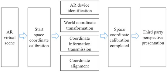 Both HoloLens and ARCore-enabled devices have the function of continuous spatial localization, which can model real space and display fixed virtual content within it. Due to the difference in devices, the coordinate systems of the two will be different when recognizing the same real space. The problem needing to be solved by the spatial coordinate alignment algorithm that is based on ARCore’s continuous spatial localization is how to align the spatial coordinates of the two devices so that they can accurately synchronize their respective operations, and finally complete the third-party perspective display function. This algorithm uses HoloLens to identify the ARCore-enabled devices and obtain the six-dimensional coordinate vectors r (relative spatial position (x, y, z) and relative rotation angle (α, β, γ)) of the ARCore-enabled devices relative to the virtual content in the HoloLens coordinate system. The virtual content is transformed from under the HoloLens coordinate system to under the ARCore device coordinate system through the spatial mapping rule T. Finally, the spatial coordinate system’s alignment is completed, as in Equation (5). Through this algorithm, the virtual content in the third-party view device can be fixed in the real world without the problem of jittering with the movement of the camera.