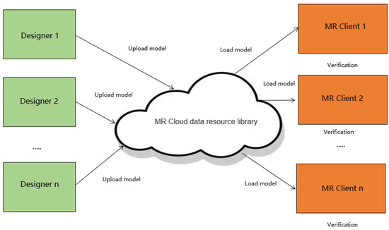 In addition to loading the model itself, 3D model-loading also requires loading scripts, maps, and textures attached to the model, which cannot be satisfied by common databases such as MySQL and Oracle. As shown in Figure 7, by establishing the MR cloud data repository to collect, store, process, and apply 3D mixed reality data, and applying the cloud server data push, the mixed reality content is dynamically loaded to the MR client interactively to realize the interconnection between the design side, server-side, and verification side. In contrast, Asset Bundle performs well in data management and compression size; the 3D model in Asset Bundle is loaded into the real scene in the MR mixed reality virtual environment by concurrent and asynchronous loading, which ensures no lag in the loading process and improves user experience.