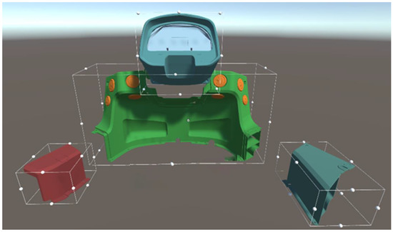 Based on the axis-aligned enclosing box technology, semi-physical platforms and 3D parts have corresponding enclosing boxes. The model is enclosed by a rectangular box, and the coordinates (x, y, z) of any point of the model in space satisfy Equation (8):