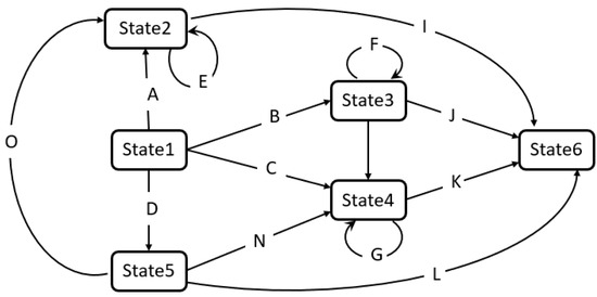 A finite state machine exists in one of a finite set of states at any given moment. When it gets an input character, it will transition from its current state to another state or remain in its current state. Any FSM can be described by a state transition graph, such as that seen in Figure 9. Here, the nodes on the graph represent a state in the FSM and the directed weighted edges represent the change of state when the input character is given. If there is no directed edge corresponding to the current state and the input character, the FSM will enter the “Doom State”, and will remain in the “Doom State” thereafter. There are two special states in the state transition diagram: State 1 is called “start state”, which represents the initial state of the FSM. State 6 is called “end state”, which indicates that the input character sequence is successfully recognized.