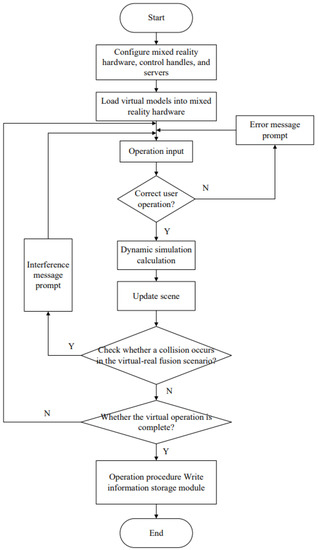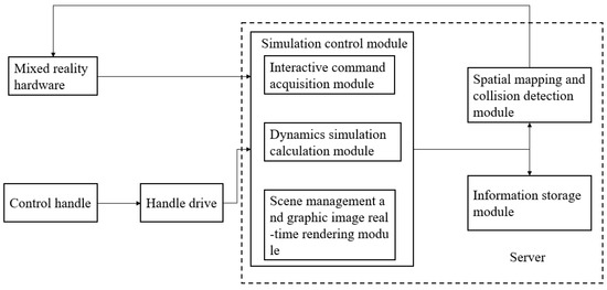 This paper develops a real-time interactive system and motion simulation system for construction machinery. The system architecture is shown in Figure 10, including mixed reality hardware, a manipulation control handle, a simulation control module, spatial mapping, a collision detection module, and an information storage module. By establishing complex mechanical constraints in the operation simulation of engineering equipment and by introducing simple constraints in the physical engine to realistically represent the motion process of each part of engineering equipment, the problem of balancing real-time and simulation effect of motion simulation is resolved. The operator can virtually control the engineering equipment in the scene and simulate the construction process in the mixed virtual environment with a combination of real immersion and interactivity, thus providing a platform-independent virtual interactive simulation method that can meet interactivity and real-time.