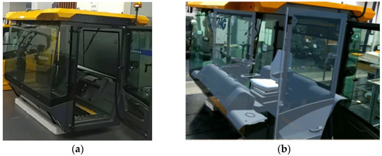 (a) The semi-physical image of the cab; (b) the virtual assembly effect of the cab.