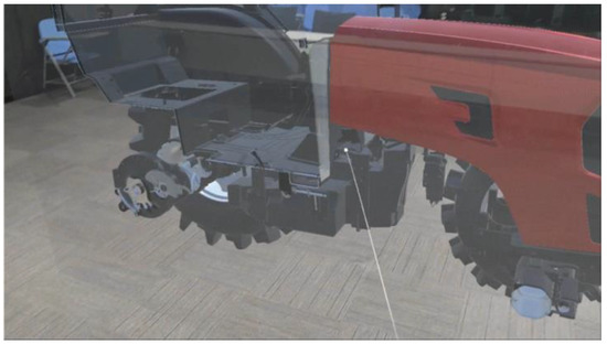 This section introduces a case of semi-physical virtual reality fusion design verification of a loader cab based on XR collaboration. Figure 12 shows the semi-physical and virtual assembly effect of the cab. In the design verification process, the designer wears an MR headset, and in this case, the best effect Microsoft HoloLens2 is selected in the current market. According to the installation sequence of the assembly path planning, the virtual 3D parts model is sequentially assembled to the semi-physical cab, then the assembly verification is completed. To satisfy different design requirements, the parts can be obtained from the server in different dynamic styles. Figure 13 shows an example of assembling a steering wheel. A logical constraint relationship is established between the cab as a semi-physical object and the assembly unit. The target position of the part to be assembled is then calculated in real-time. The installation position and angle are automatically matched when it lies within the threshold of the assembly range, which realizes the automatic adsorption function of the part to the corresponding installation position magnetically. When the virtual 3D model collides with semi-physical or other virtual models, it can detect and remind the assemblers of the color change of the outer frame. Thanks to the assembly path planning and collision detection technology, the whole virtual assembly verification process of the cab takes about 15 min, which shortens the verification time and facilitates repeated verification.