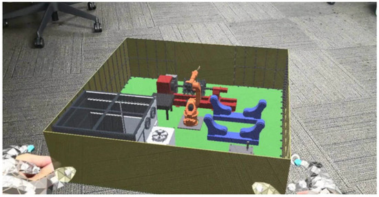 In order to minimize the cost of virtual objects and enhance the user’s sense of reality, MR technology is proposed to solve the layout problem of factory production lines. As early as 2011, Lee [45] proposed a virtual factory layout planning system based on deploying the method of a mixed reality digital manufacturing environment. Similarly, MR technology is also applied to the layout of indoor furniture, where various three-dimensional computer graphics (such as sofas, beds and lamps) are superimposed on the real space, allowing users to visualize interior design [46]. The factory layout works the same way as the interior layout, positioning virtual objects in the real world and observing the rationality of the layout with the help of an MR headset. The factory layout verification scheme proposed in this paper not only realizes the traditional production line layout, but also realizes the virtual production line simulation and simulates the real working environment. Considering the complexity of the actual production line, the current production simulation can only simulate routine operations, but cannot simulate the abnormal phenomenon such as equipment failure. MR tools are superior to traditional simulation software in terms of both planning quality and flexibility.