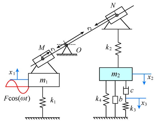 It should be noted that the influence of the inerter depends significantly on the terminal locations. The amplification ratio of the lever increases means that the distance between the inerter position and the primary system increases, and then the force provided by the inerter will be amplified. We define as the amplification ratio of the lever mechanism. Ignoring the mass of the lever and the frictional resistance in the movement, according to Newton’s second law and lever principle, the governing equation of the system is established as