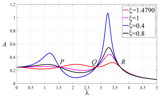 According to Equation (6), for given values of , , , , , L, the amplitude amplification factor A of the primary system can be plotted with respect to . In Figure 2, the normalized amplitude–frequency curves of model with several different damping ratios of 0.2, 0.5, and 0.8 are given. The curves all pass through three fixed points P, Q, and R, which are independent of the damping ratio.