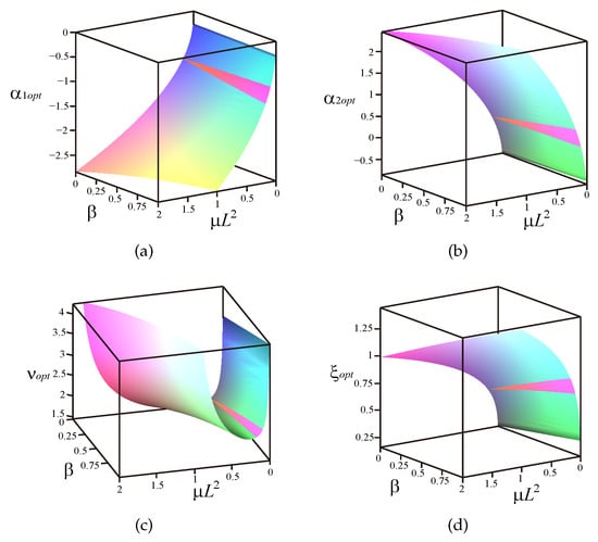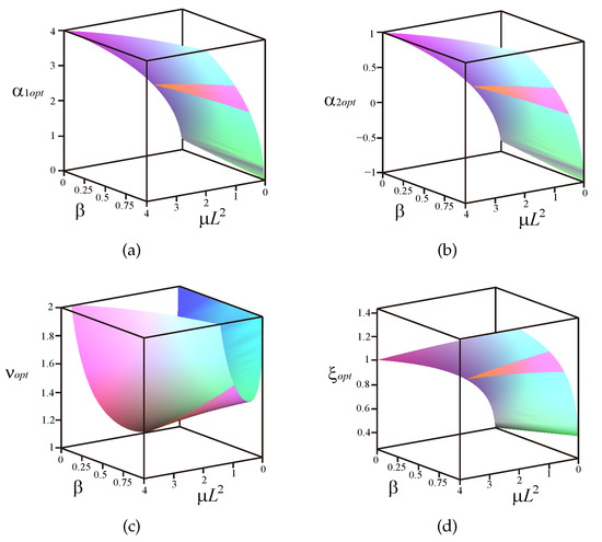 Considering the needs of practical engineering applications, we give the relationship between the optimal parameters in Equations (28) and (29) and the system parameters , L, and under different cases. The coupling term is taken as abscissa, and the inerter–mass ratio is taken as ordinate. It can be observed from Figure 6 and Figure 7 that the system is stable within the range of the selected parameters.