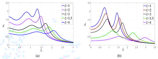 The mass ratio and inerter–mass ratio are selected for the two cases. The value of the amplification ratio L is greatly related to the maximum amplitude of the primary system. The amplitude–frequency response curves of the primary system with different values of L are given in Figure 8. As we can see, the larger the amplification ratio is, the lower the amplitude and the wider the distance between the two resonance peaks are.