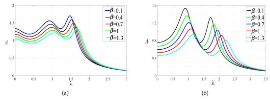 The mass ratio and magnification ratio are selected. The inerter–mass ratios are selected within the working range of inerter for the two cases. The normalized displacement amplitude–frequency response curves of the primary system with different values of are shown in Figure 9. We find that the larger the inerter–mass ratio is, the lower the amplitude and the better the effect are.